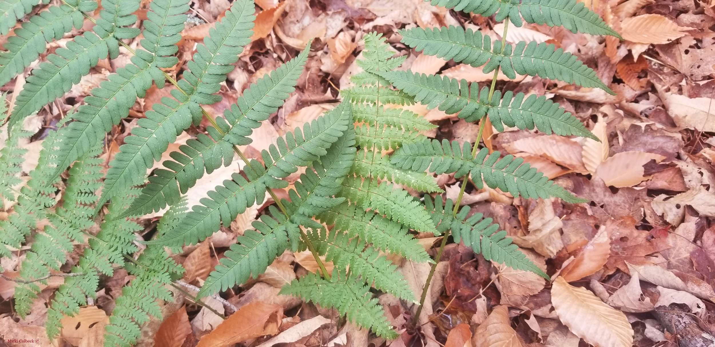 Some Dryopteris species of wood ferns are evergreen. Dry is Greek for wood, and Pteron, for feather. The two common locally are Dryopteris intermedia and Dryopteris marginalis, the Intermediate Woodfern and Marginal Woodfern. They are the two lacy evergreen ferns we find throughout winter, with intermediate more lacy than marginal. The sporangia have mostly flung their spores to the winds by winter, but if you find any that remain, they’ll be in the middle of the leaf on D. intermedia and on the margins of the leaf on D. marginalis.
