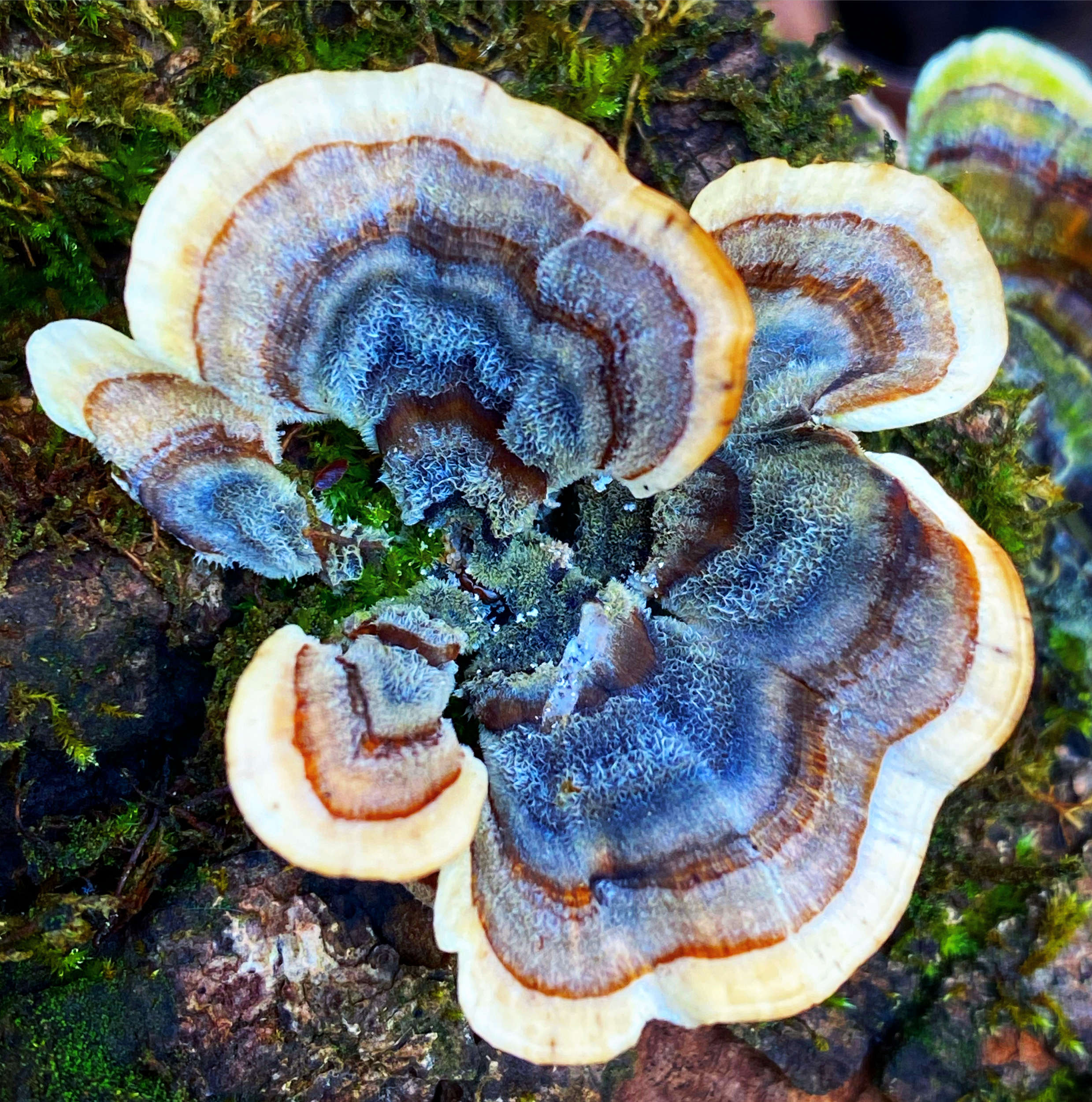 Late autumn’s thick layer of fallen leaves can obscure many ground-dwelling mushrooms, making them difficult to find. Wood-inhabiting fungi, elevated above the leaf litter, can be easier to spot. Gorgeous Turkey Tail Mushrooms (Trametes versicolor), whose fruiting bodies resemble the fanned-out plumage of a strutting wild tom turkey, grow in overlapping clusters and rosettes on decaying hardwood stumps and logs. It is uncommon for one species of mushroom to display a wide range of color variations, but Turkey Tails do just that. Their species name, versicolor, actually means ‘of several colors’ and perfectly describes the vast array of hues—shades of brown, grey, lavender, and even blue—arranged in concentric bands on the mushroom’s caps. These fungi can occasionally persist year-round, and algae may colonize older specimens and tint them green. As key members of nature’s recycling crew, decomposers such as Turkey Tails play an essential role in the forest ecosystem by breaking down wood and other organic matter and releasing nutrients back into the environment where other organisms can utilize them.