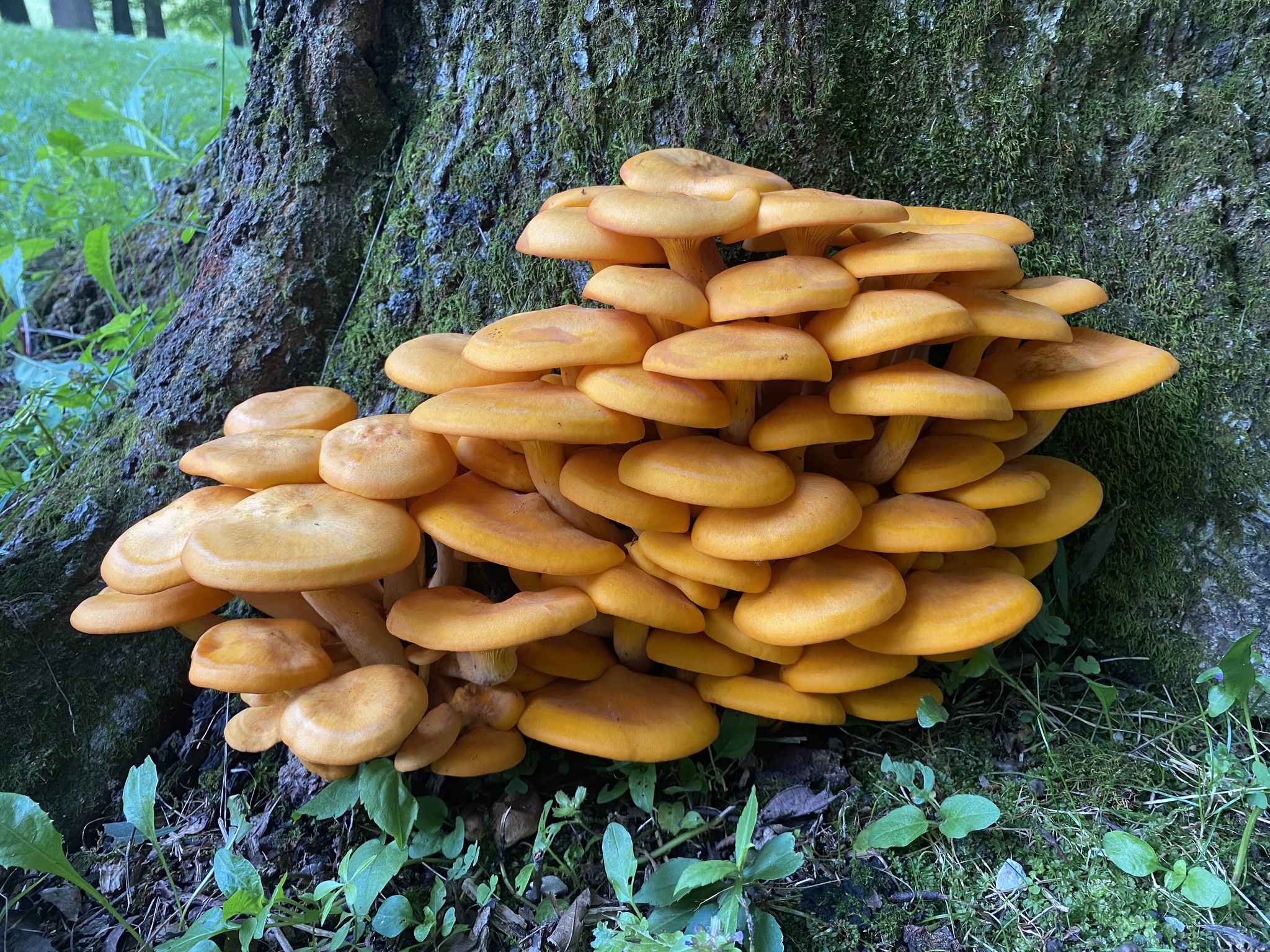 While carved jack o’lanterns are lighting porches and front steps, their mushroom counterparts illuminate the forests with an eerie glow. The bright pumpkin orange Omphalotus illudens, or Eastern Jack O’ Lantern Mushroom, is bioluminescent! Amazingly, the gills of this species emits a faint green light that can be seen on the darkest of nights. The light is produced by an enzyme called luciferase, the same type of chemical responsible for bioluminescence in fireflies. You can find these large, showy mushrooms growing in dense clusters on hardwood stumps and buried, decaying tree roots. Foragers hunting for edibles such as Chicken Of The Woods and Chanterelles should be careful not to confuse them with the poisonous jack o’ lantern mushroom. Though not deadly, consumption can cause severe gastrointestinal symptoms that can last several days.