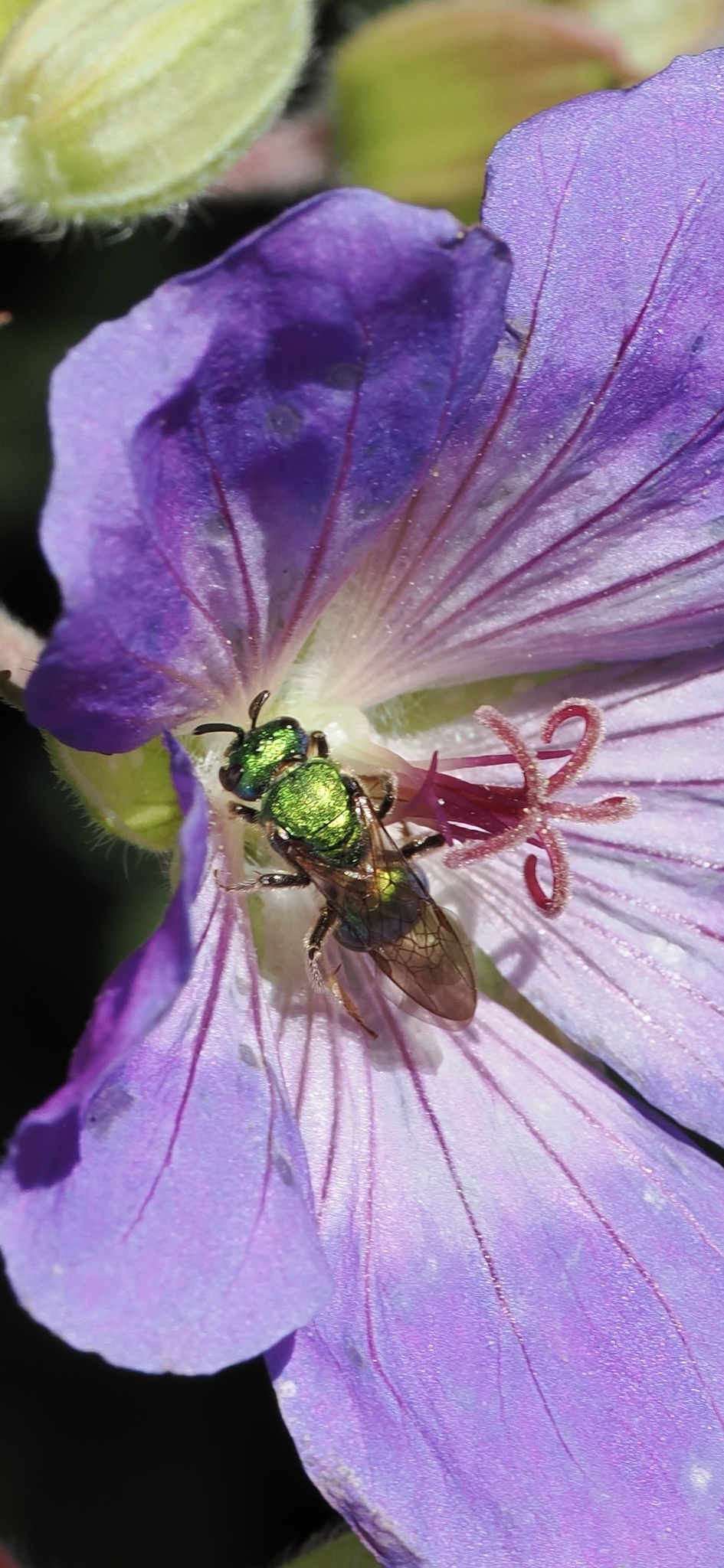 For simplicity, bees can be separated into two types. There are those in which the males and females overwinter. Then there are those in which mating occurs at the end of the season and only the adult females survive the winter (hopefully fertilized with all the genetic material they need to produce female offspring next summer). In the Northeast, the latter type is composed of Bumble Bees (genus Bombus) and Sweat Bees (family Halictidae) and it is these two that make up the majority of October bees.