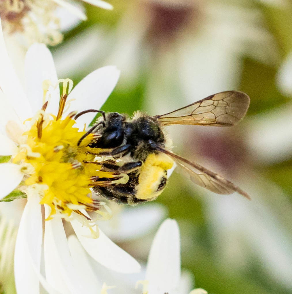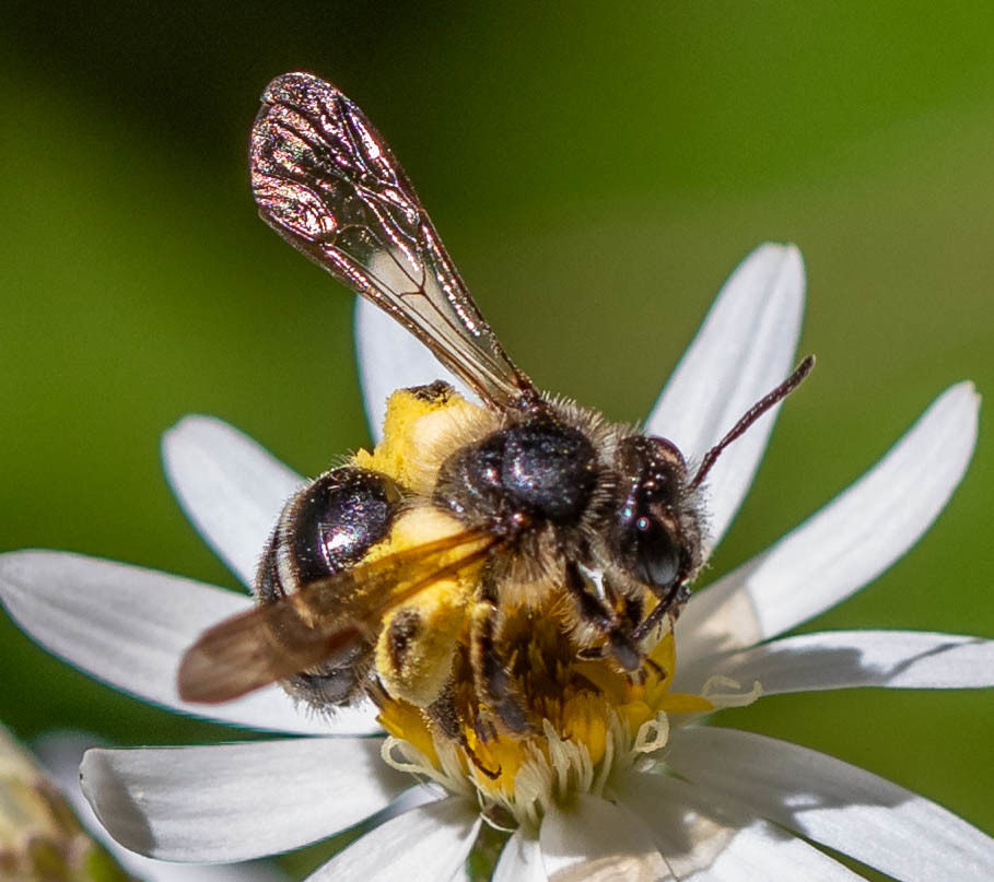 With shortening days and falling temperatures, September marks the beginning of the end of the bee-watching season. But despite the fading flowers, a few species complete nearly their entire adult lives this month. One of these late fall species is the Roberval Miner (Andrena robervalensis), named for Roberval, Quebec, where the type specimen was collected. Well, at least that’s what we are calling it right now. These September-active, dark-haired lovers of asters are distinctive among the Vermont fauna, but there is considerable taxonomic uncertainty in this group of mining bees. Some authorities consider Andrena runcinatae and Andrena robervalensis the same species, with the name A. runcinatae having precedent since it was described first.