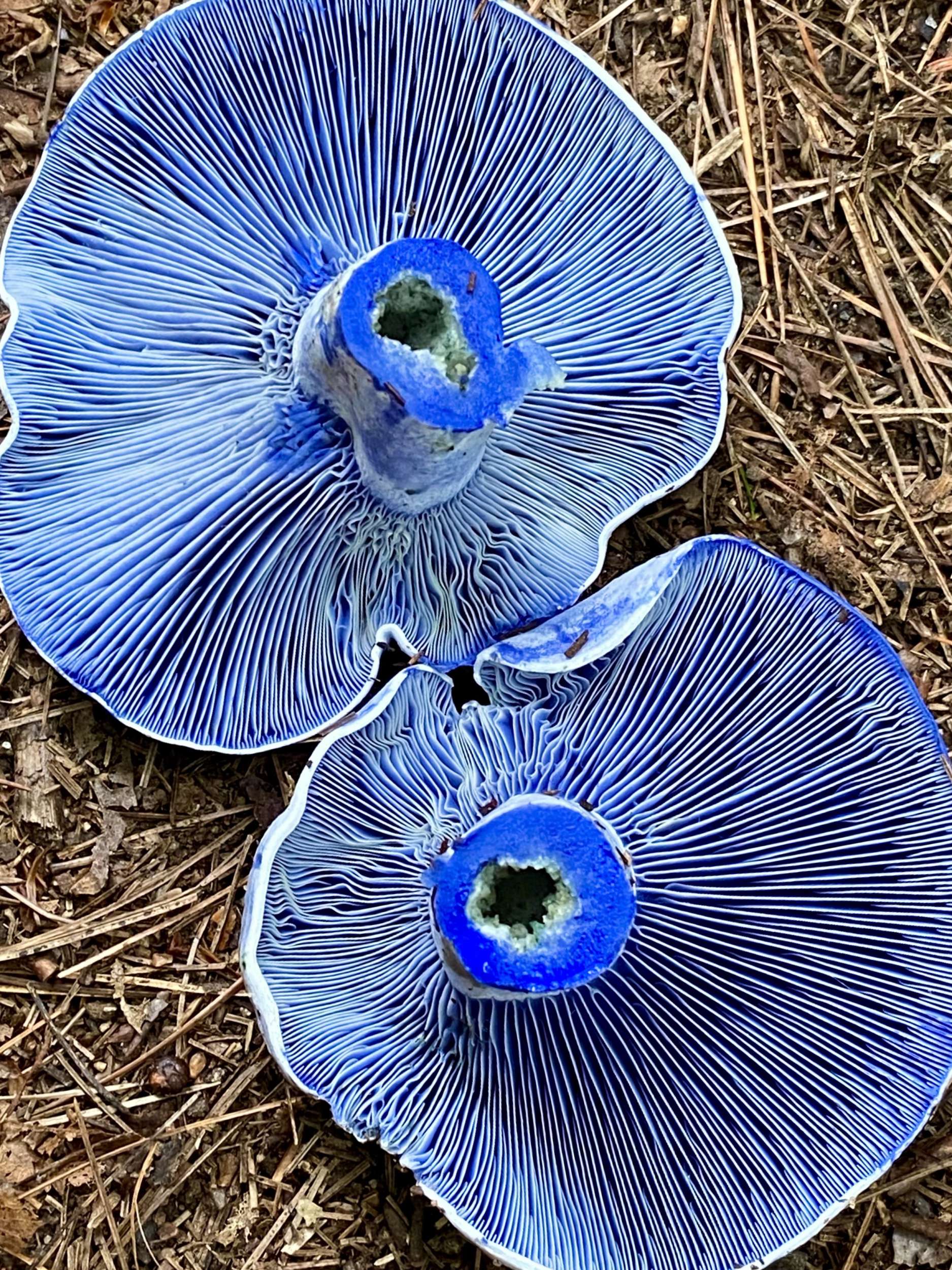 Very easy to identify, Indigo Milk Caps display a range of true blue shades not often found in nature. The cap of this medium-large (up to 15 cm across) mushroom is lovely, pale silvery-blue, sometimes with concentric rings of alternating light and dark shades, and can be quite sticky when fresh. A peek at the underside of the cap reveals gorgeous cobalt blue gills which run partway down the stem, a feature known as “decurrent” in mycology. The thick stem is often decorated with small pits and potholes called scrobiculi. When cut or damaged, all parts of the mushroom weep a deep indigo blue sticky “latex.” This liquid is characteristic of Lactarius, a large genus of fungi commonly known as milk caps (or milky caps), which contains over 500 known species worldwide. The latex acts as a deterrent, gumming up the mouthparts of hungry creatures such as slugs and snails, which would otherwise try to make a meal of them.