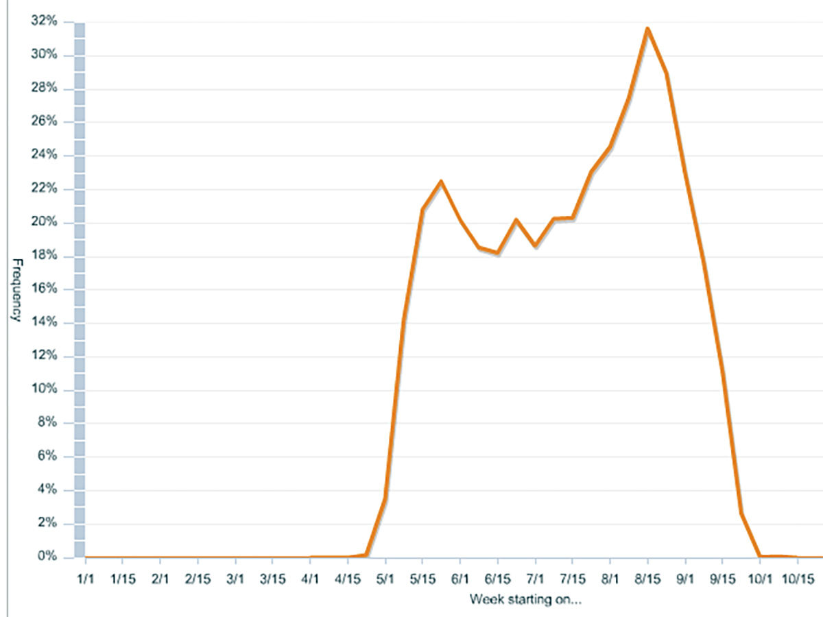 When the flowers stop blooming and insects stop flying, Ruby-throated Hummingbirds head south. Some adult males start migrating south as early as mid-July, but southward migration peaks in August and early September. By October, they’re all gone.