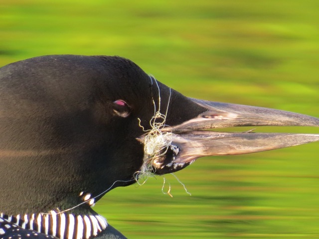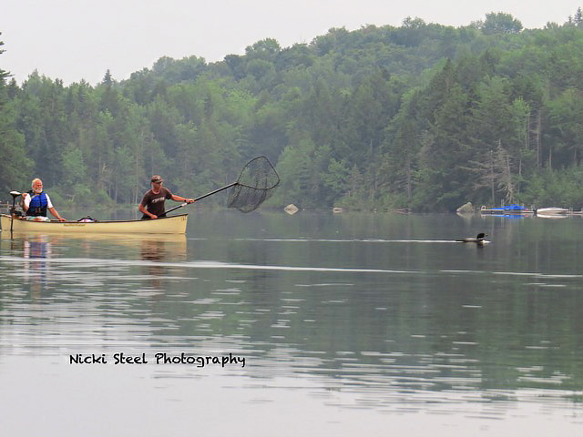 I was helping VCE volunteer Henry Dandeneau place nest warning signs around a nest island when I noticed a sleeping loon very near shore. Something was amiss. Upon closer inspection, we saw that the loon had fishing line wrapped around its bill and head. Its mate sat nearby on the island nest, incubating eggs. Henry and I went right to work hatching a plan to return for a rescue attempt. By the time I made the 3.5 hour drive south for the second time a few days later, the pair had abandoned the nest. The loon (we call it FL—Fish Line loon) had re-joined its mate out on the main lake and easily avoided our nighttime spotlighting capture attempts, diving every time we got close. In fact, we only saw FL twice in over 90 minutes of searching. Wilmington resident and VCE volunteer Nicki Steel continues to monitor FL three to four times a week. She observes it dive, preen, and eat small fish. The fishing line has loosened over time, but has caused an infection at the base of the bill. FL catches larger fish, but cannot eat them. We’ve tried two more capture attempts to no avail. Nicki and others will continue to follow FL into the fall and report on whether it weakens or seems well enough to fly and migrate on its own.
