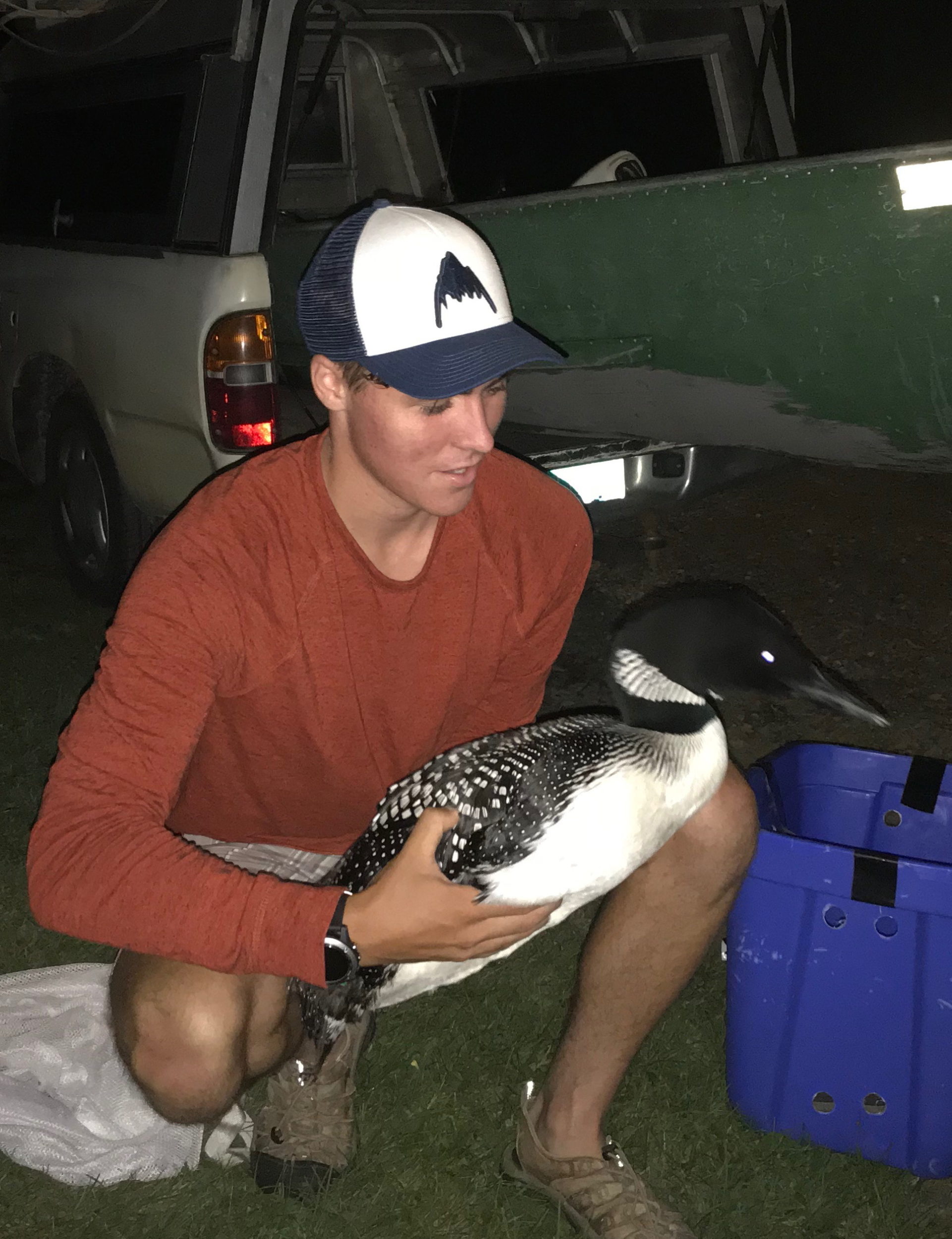 Every year, some of our returning loons manage to get themselves into “hot water” so to speak. They ingest fishing gear, get sick, or land in the wrong places (like on roads, in fields, or ponds too small to allow loon lift-off)—and then my phone rings. We do our best to respond to every situation, which often includes calling on our dedicated volunteers to monitor a loon for days or weeks, or jump into a small boat with me in the dark of night with spotlights and a giant dip net to catch an injured loon. We attempt most captures at night because loons tend to follow spotlights, allowing us to get close with the net. Sometimes we are successful and the loon lives to migrate another year, and sometimes despite our best efforts, we are not.
