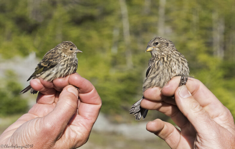 Juvenile Pine Siskin and White-winged Crossbill captured on Mt. Mansfield. © Charles Gangas