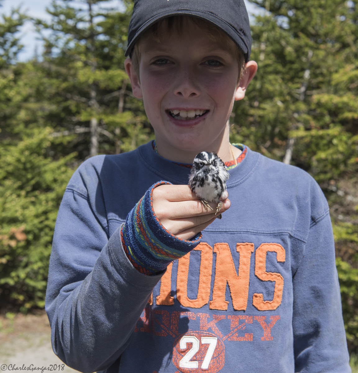 Quinn Collins shows off a handsome Black-and-white Warbler on Mt. Mansfield. © Charles Gangas