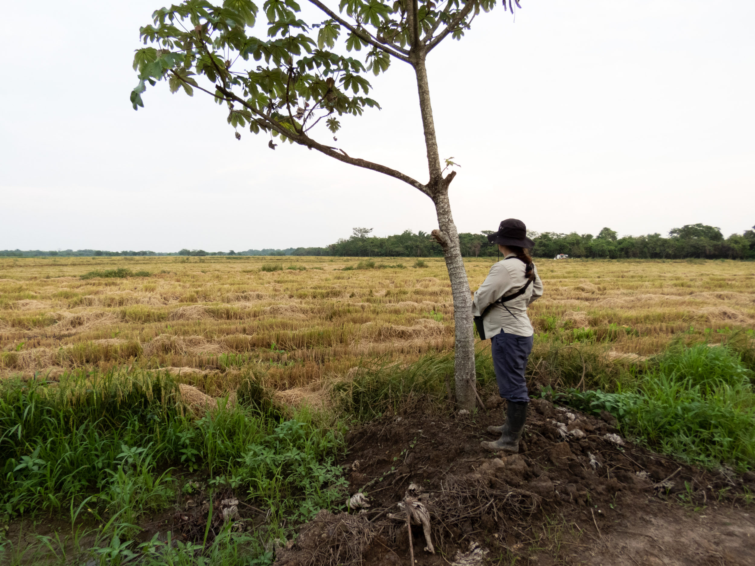 Yanira Cifuentes looks out over a recently-harvested rice field visited by tens of thousands of Dickcissels each year, plus unknown numbers of Bobolinks. / © Rosalind Renfrew