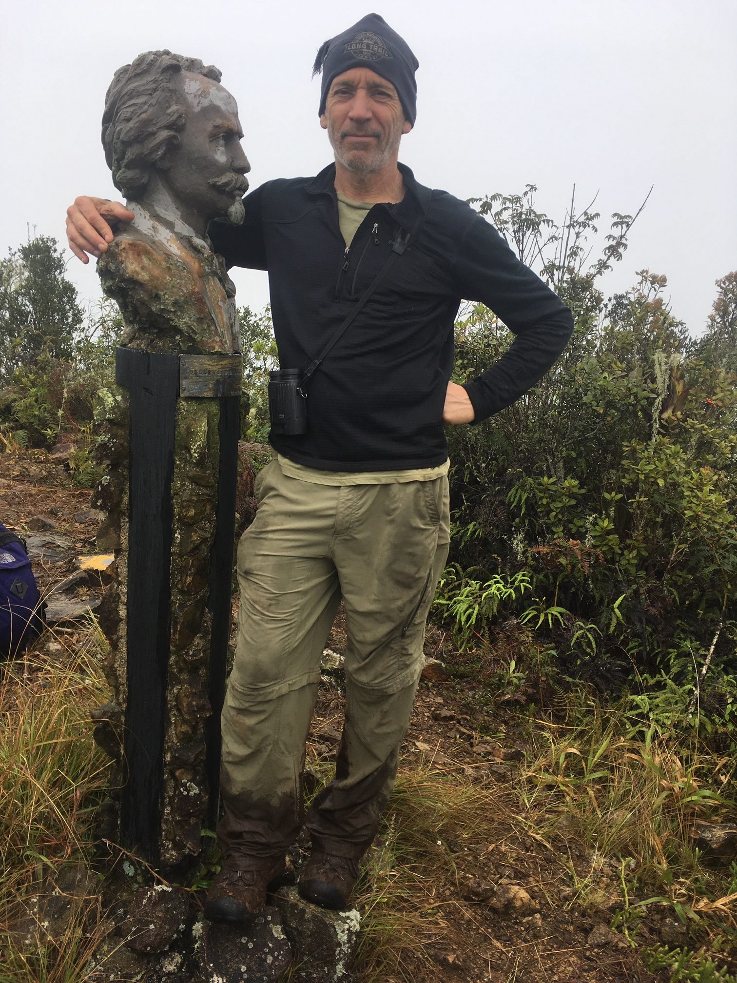 Chris remarked, “We were almost definitely the first humans to ever reach the area that we did, a remarkable and humbling feeling. Weather was tough with a lot of rain, and we were thoroughly soaked and filthy from many muddy falls on steep slopes. We couldn’t make anywhere near the progress we’d hoped, as cutting new trails through the dense cloud forest terrain was slow and difficult, plus weather slowed us down. Using machetes in soaking wet, slippery conditions is not highly recommended, not to mention that we had to hike each morning from our base camp at 1500 m to the summit of Pico Bayemesa (1752 m), where the existing trail ended, and steeply down from there to our new trailblazing route.”
