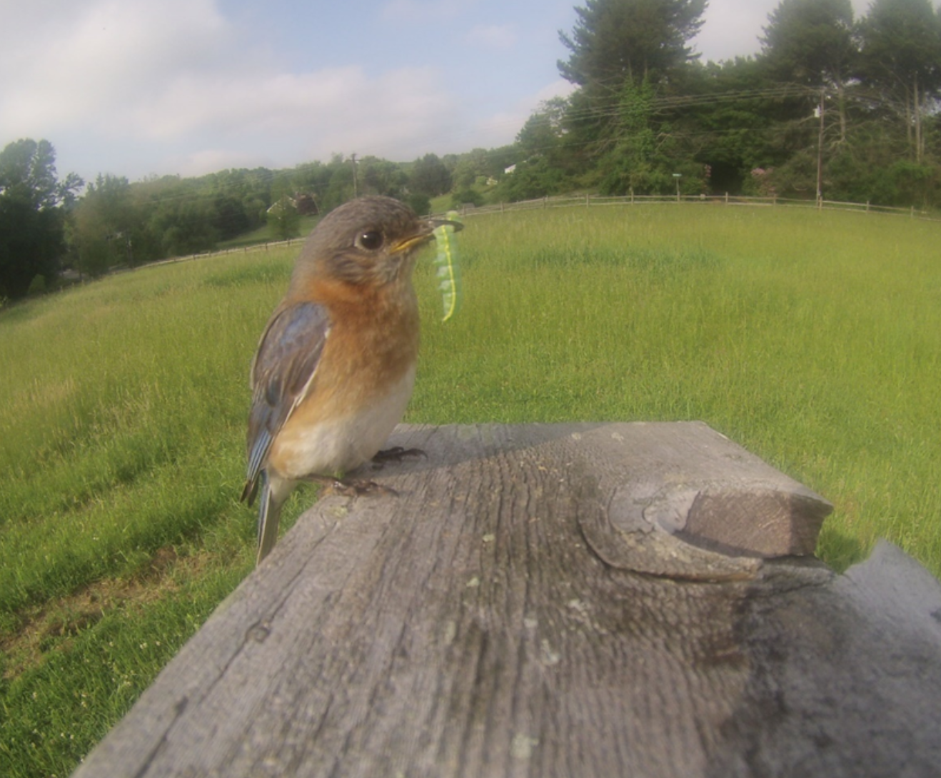 A female Eastern Bluebird on the roof of a nest box, before provisioning nestlings with prey (Amphipyra pyramidea caterpillar) at Mt. Cuba Center, New Castle County, Delaware, June 2016. Photo taken with a GoPro® HERO 3+. Photo by Ashley Kennedy.