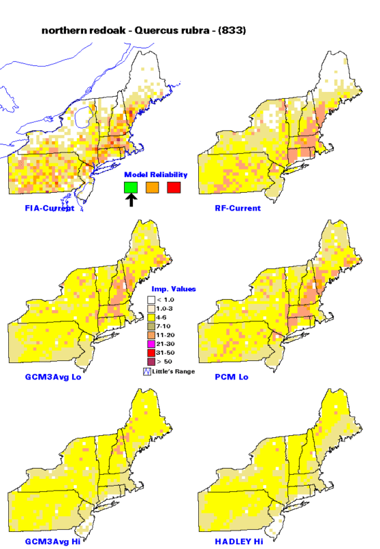 Current and predicted Northern Red Oak distribution from the USDA Forest Service Climate Change Tree Atlas.