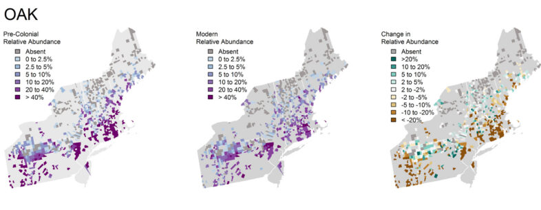 Town-scale relative abundance of oak within 701 colonial townships. Pre-colonial (left); Modern taxa (center); change in abundance between the eras (right),