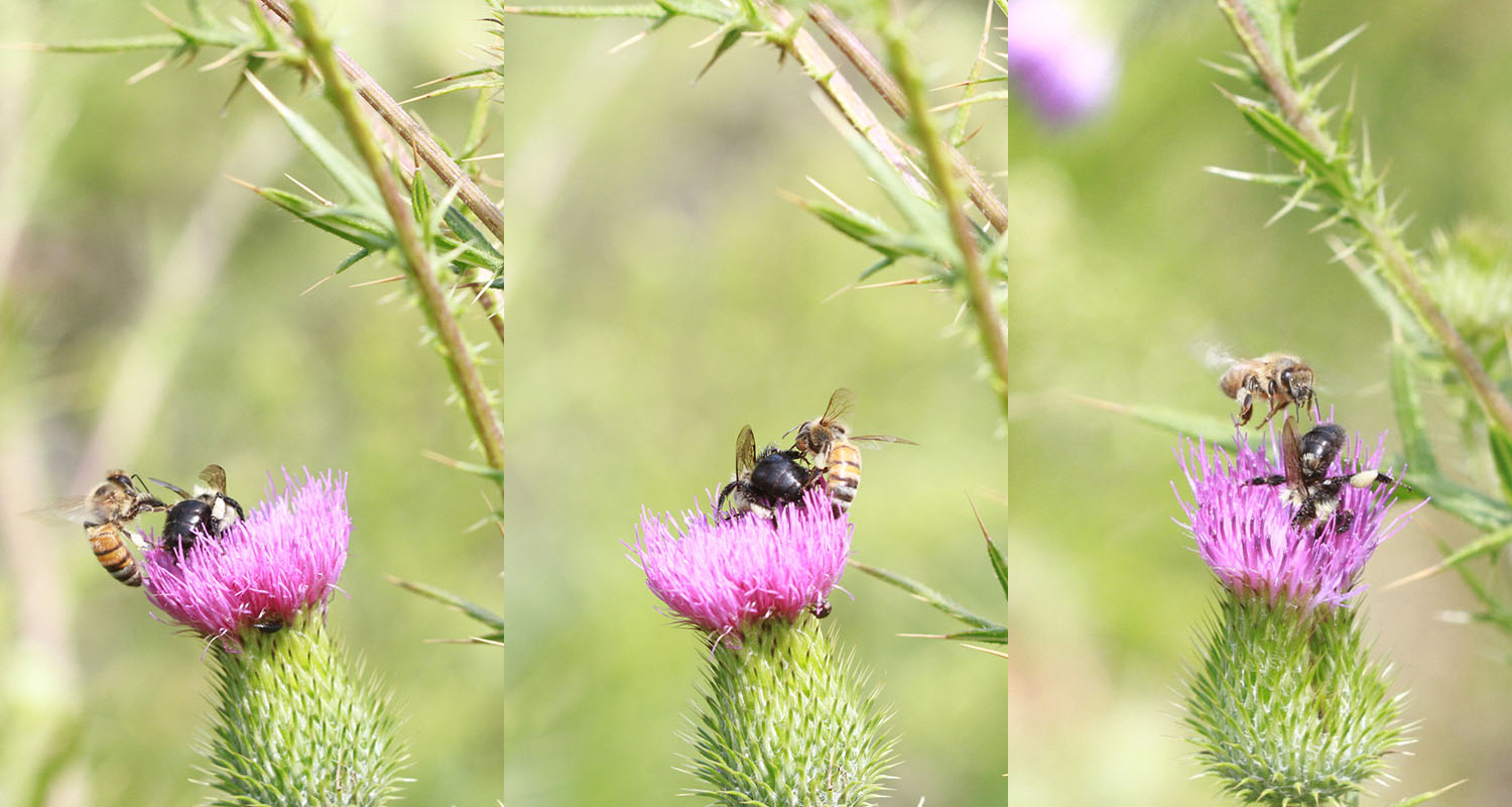 A Western Honey Bee robbing pollen from the corbicula (pollen baskets) of a Common Eastern Bumble Bee in Illinois. © Alma C. Schrage. While not a common behavior, it has been reported previously reported in the literature (Jean, 2005).