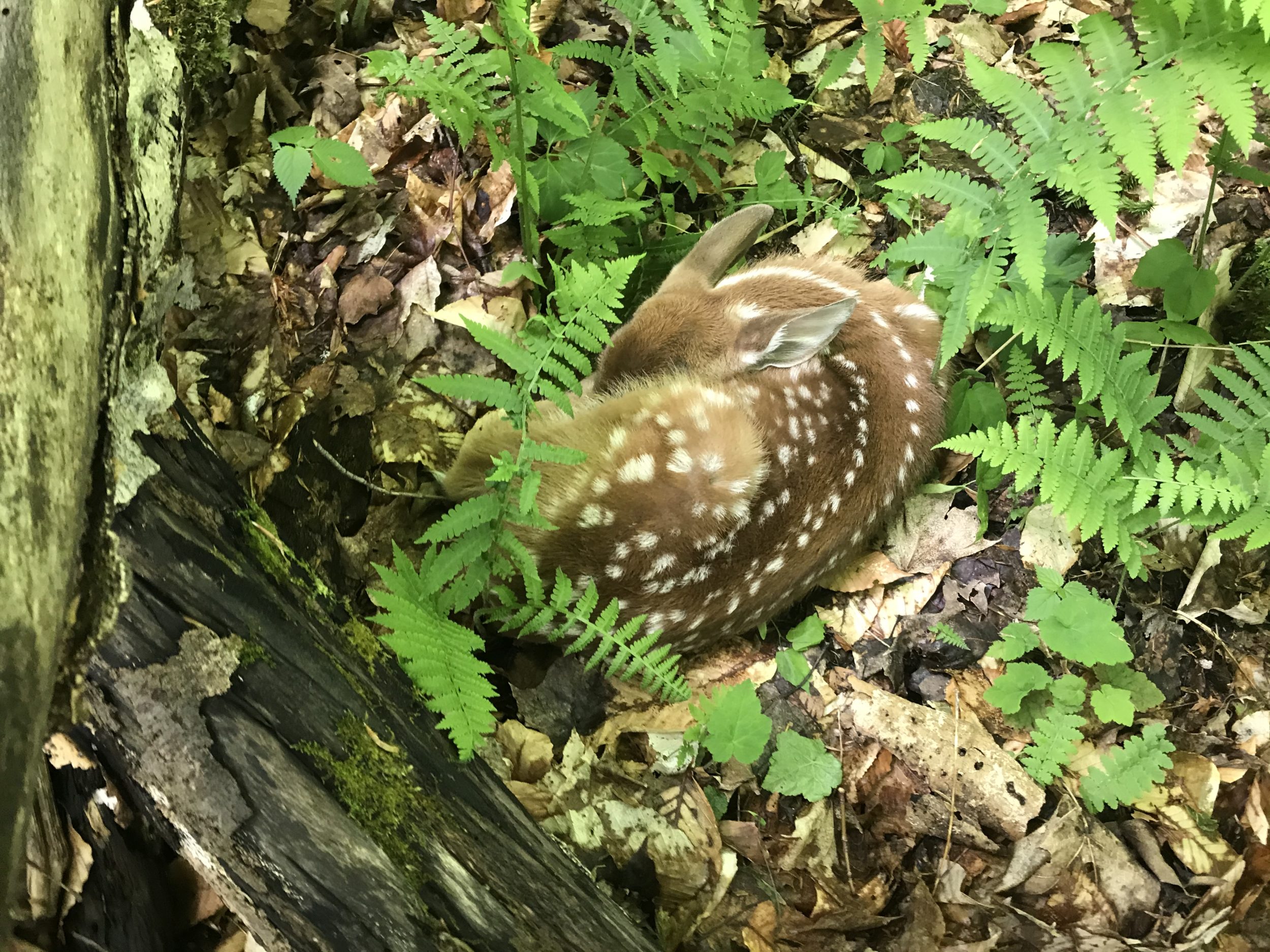 At today’s point counts, I hear the songs and calls of many interesting birds, from the high-pitched “p-seeeee” of a Broad-winged Hawk to the “zee zee zee zoo zee” of a Black-throated Green Warbler and the sharp “iikkk” of a Rose-breasted Grosbeak, reminiscent of a sneaker squeaking on a gym floor. I also have a series of encounters which I can only describe as remarkably beautiful. First, I come face-to-face with a female American Redstart sitting on her nest just feet in front of me. She is so unobtrusive that I only notice her as she flies away. Walking over to the spot from which she flew, I get a glimpse of her tan speckled eggs tucked into a delicately-crafted nest. Just minutes later, lost in my thoughts as I reflect on this encounter, I almost step on a young fawn hidden in the dense underbrush. It’s sleeping peacefully, sometimes twitching its legs as if it’s running in its dreams. I stare in amazement for a few moments, then back away slowly and walk a wide circle around it. I will later learn that very young fawns lie still as a natural defense against predation until they are old enough to stick with their mothers throughout the day.