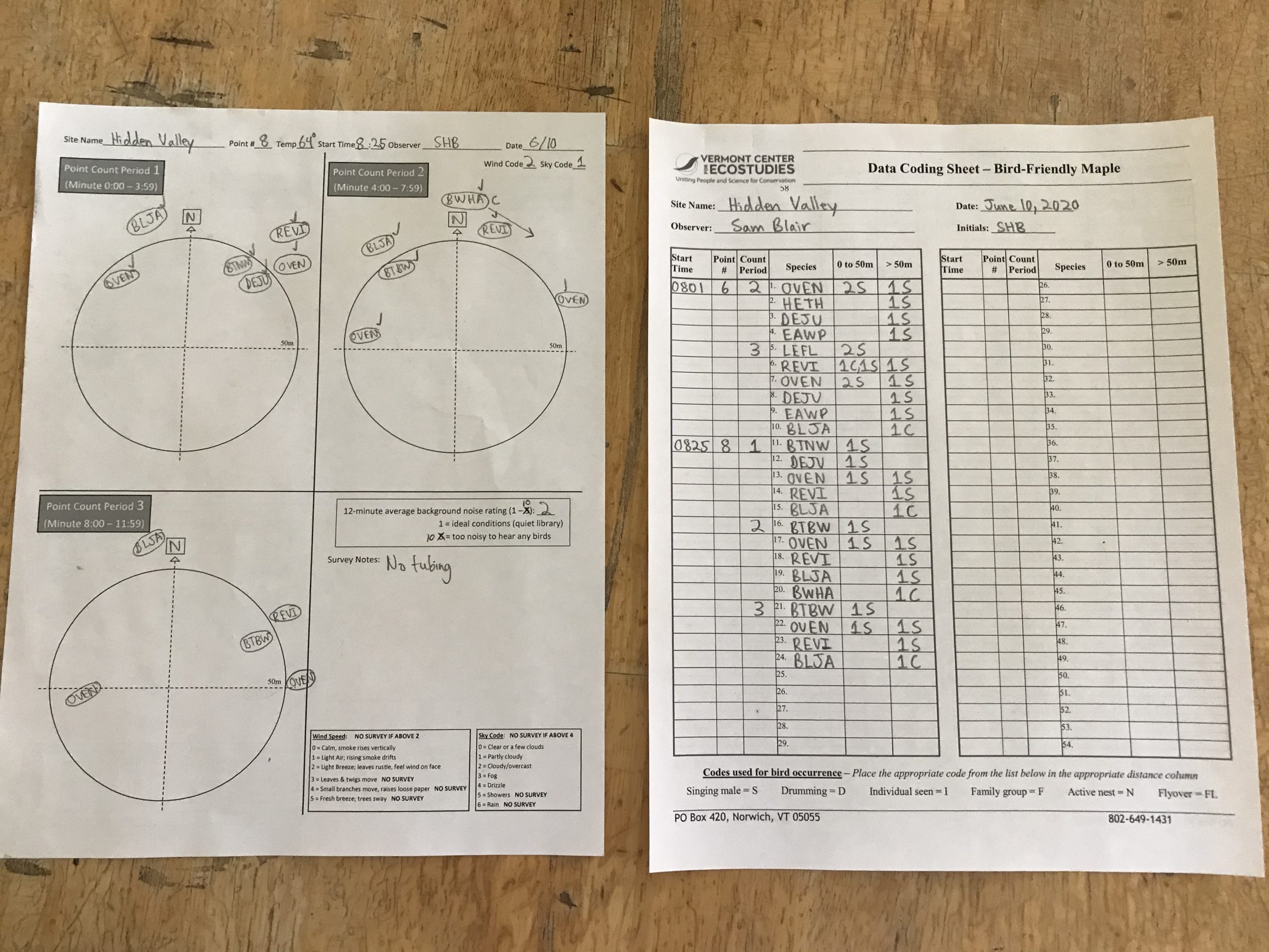 That’s where the Vermont Center for Ecostudies comes in. The Bird-friendly Maple Project, which began in 2014, has enrolled more than 30 producers over the past five years, but that’s just a fraction of the possible reach it could achieve. What’s missing is a statistically valid, evidence-based scientific study investigating whether the BFM guidelines have a measurable impact on bird populations. Such a study has the potential to point towards areas where the project could adjust its guidelines to have a greater effect on species richness and abundance. Ultimately, it could help the BFM project move from its current status as a recognition program towards becoming a true certification program like the “Organic” labeling, with the potential for a commensurate increase in prices for producers. VCE’s role in this high-impact conservation strategy is to provide the sound research that will ground and validate BFM guidelines as the project moves forward—which brings me back to the field, and to that long drive into the mountains.
