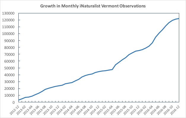 2016 was a big year for iNaturalist Vermont. We had 777 naturalists contribute 43,182 observations for over 3,000 species. Nearly 900 naturalist helped to identify and verify data. Naturalists reported observations from 232 (92%) Vermont towns. And we join the more than 85,000 iNaturalists worldwide that have submitted nearly 3.5 million observations! In 2016 alone, over 1.5 million verifiable observations have been uploaded by over 55,000 users, iNaturalist was featured on NPR, and served as the platform for the National Park Service’s Centennial Bioblitzes, among many other highlights.