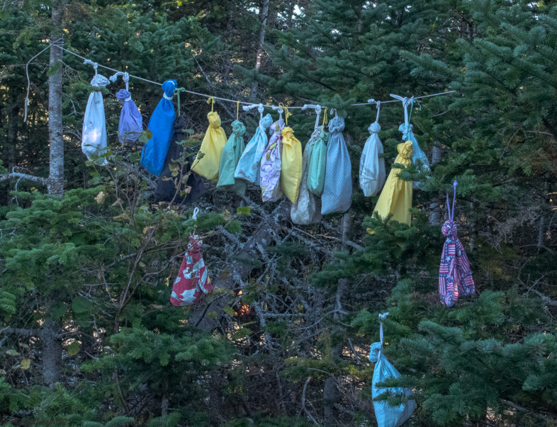 The VCE avian “clothesline” on Mt. Mansfield was festooned with bird bags on 20-21 September 2021, as migrants filled our mist nets. The number of birds captured often exceeded the availability of bags, some of which held 3-4 kinglets simultaneously! © Charles Gangas