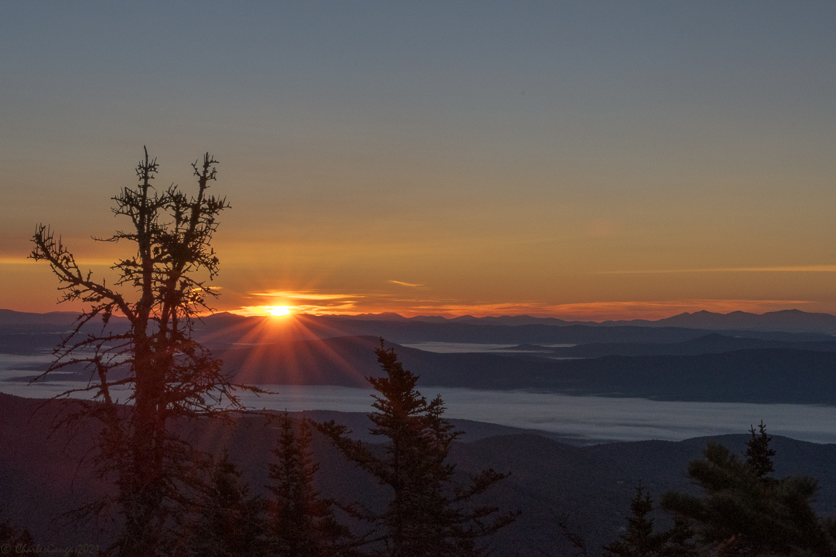 Sunrise from the Mansfield ridgeline, with clouds clinging to the Stowe valley below, 20 September 2021. © Charles Gangas