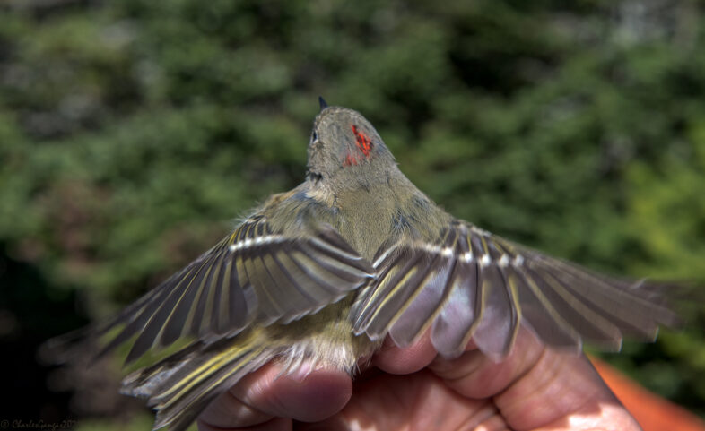 A demonstrative male Ruby-crowned Kinglet, one of 55 individuals banded by VCE on the Mt. Mansfield ridgeline, 19-21 September 2021. © Charles Gangas