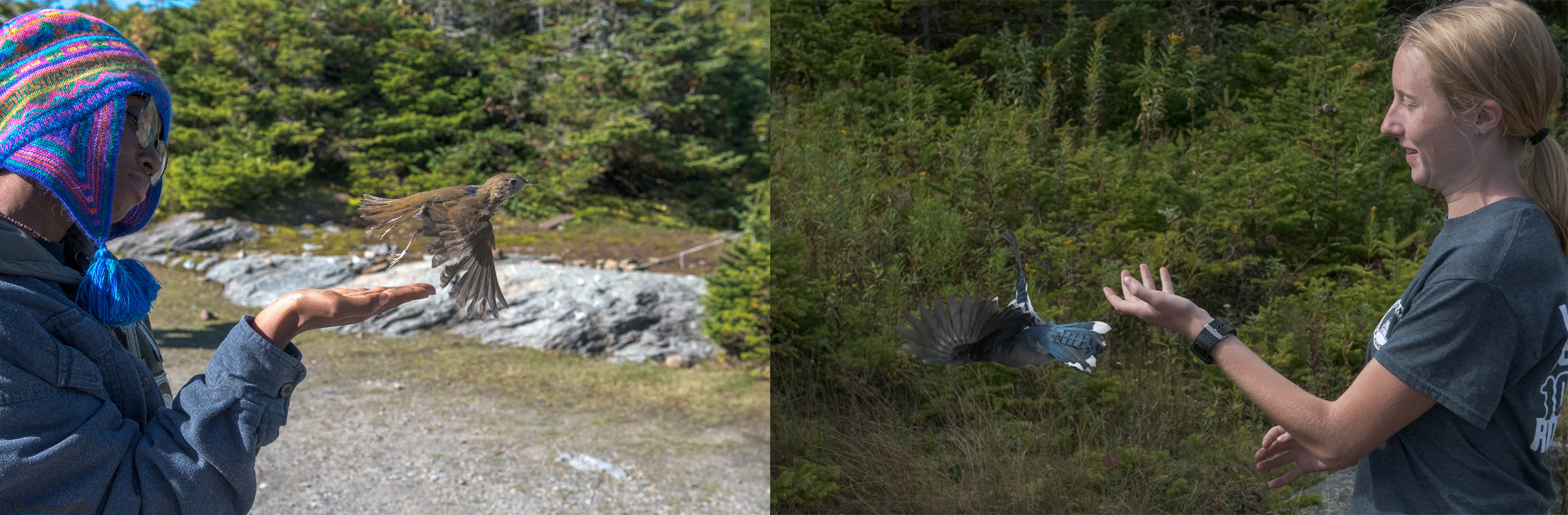 The future of bird conservation, south and north: VCE friend Prisca Felix (left) from Haiti releases a banded Bicknell’s Thrush (which may soon be in her country), and VCE AmeriCorps member Abbie Castriotta (right) sends off a banded Blue Jay. 20-21 September 2021, © Charles Gangas