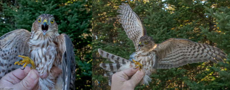 An immature male Sharp-shinned Hawk had no qualms about expressing his concerns over the banding process. 20 September 2021, Mt. Mansfield. © Charles Gangas