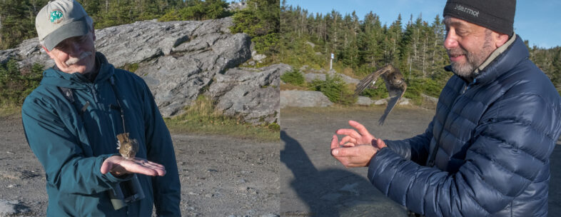 VCE Advisory Council member Rick Bowe (left) releases a GPS-tagged Bicknell’s Thrush, while VCE friend and birding enthusiast David Tobias (right) experiences a rare BITH release head-on towards the camera. © Charles Gangas