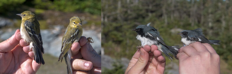 Immature Blackpoll Warblers (left), the quintessential “confusing fall warbler”, contrast markedly with immature Black-throated Blue Warblers (right), arguably the most distinctive wood warbler in autumn (right). 21 September 2021, Mt. Mansfield. © Charles Gangas