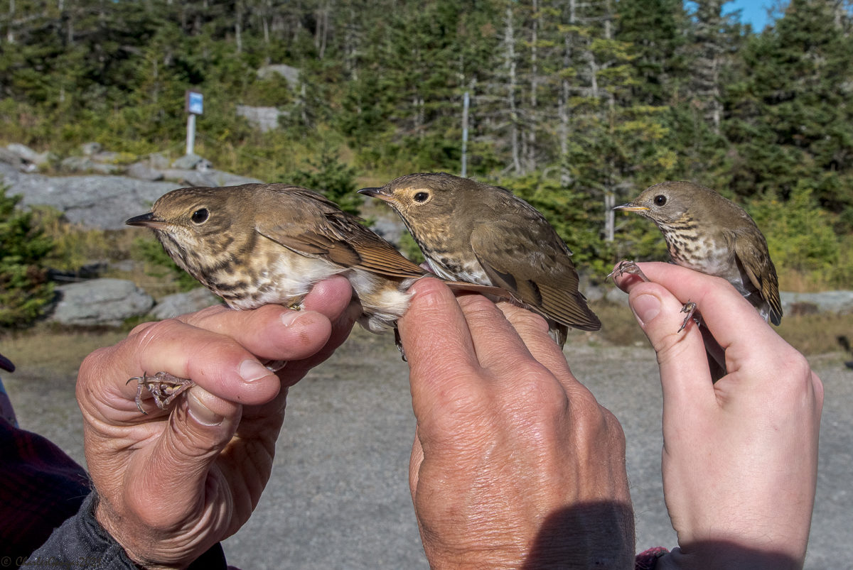 A challenging-to-identify trio of Catharus thrushes on Mt. Mansfield, 20 September 2021. From left: Hermit, Swainson’s and Bicknell’s. © Charles Gangas