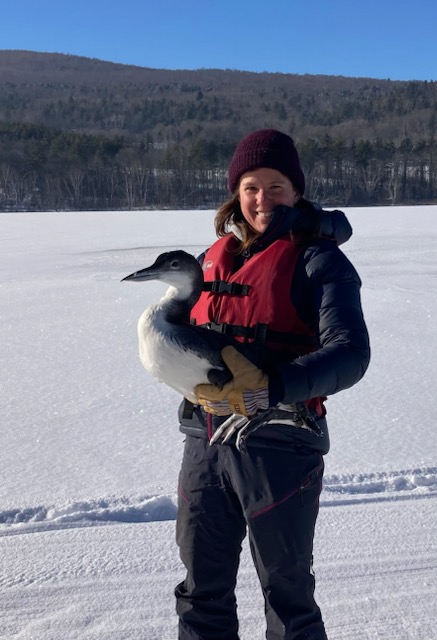 We cannot save every loon, but sometimes, circumstances align. This time, the ice was safe, and predators like eagles had not yet discovered the stranded bird. When Phil gave us a call on December 26 and told us the loon chick was still alive, I ventured out to Berlin Pond with my colleague Eloise Girard, a seasonal biologist with the Vermont Loon Project for the past four years.
