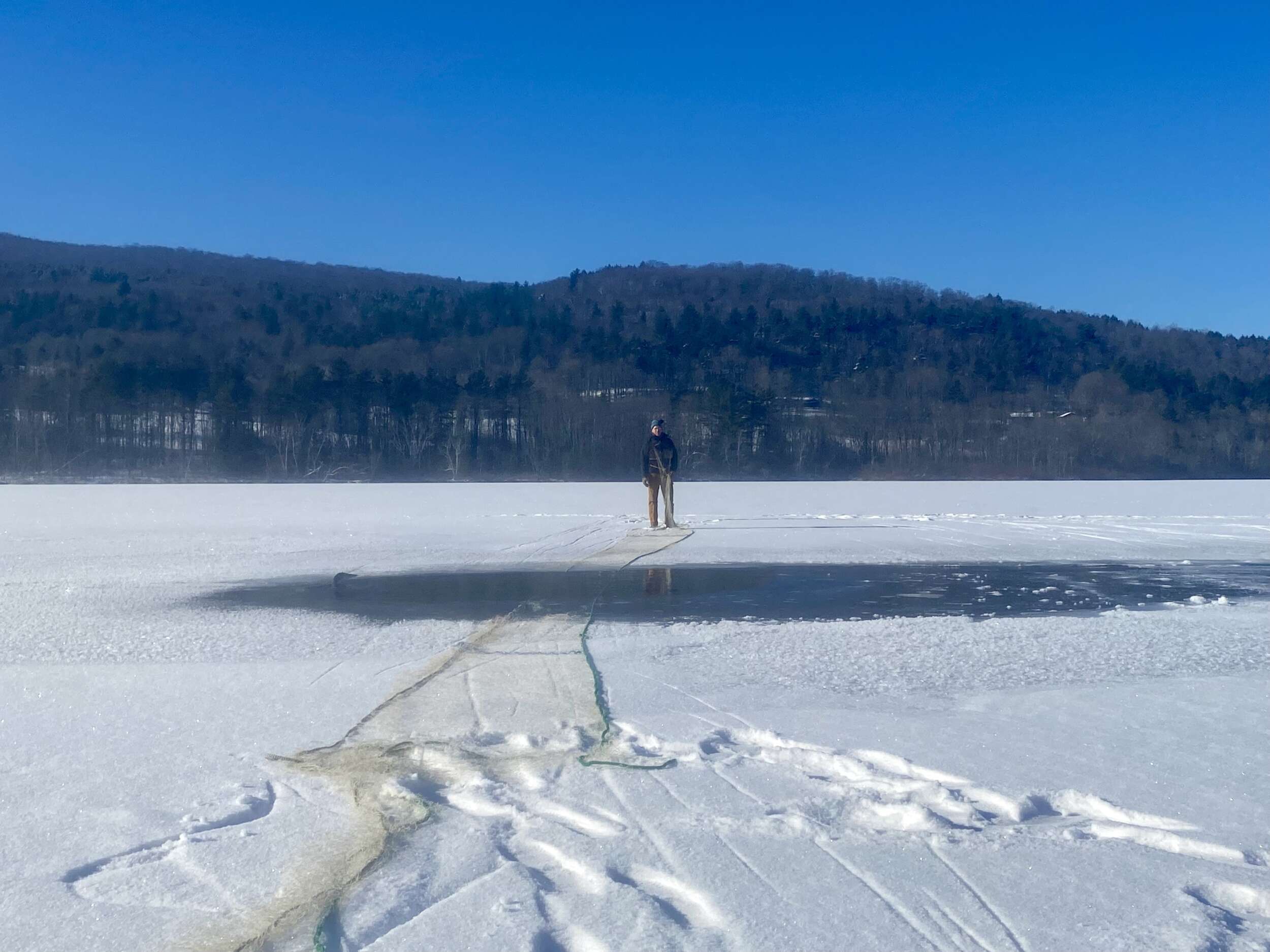 VCE Loon Biologist Eric Hanson stands on the other side of an ice hole in Berlin Pond, preparing to rescue a stranded loon chick with a net.