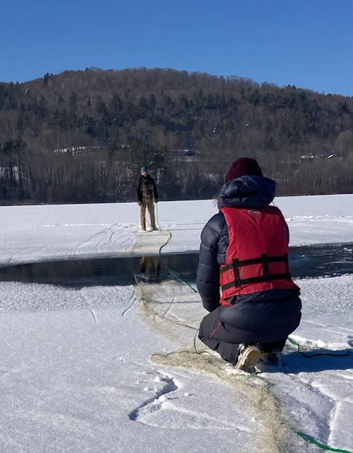 For Eloise, this was her first ice rescue. Using a 125-foot gill net to capture the loon from the icy water was a new experience for all of us. After successfully netting the chick, we put the bird in a travel box and drove to the ECHO Center in Burlington, where we released the bird onto Lake Champlain, a lake with plenty of open water.