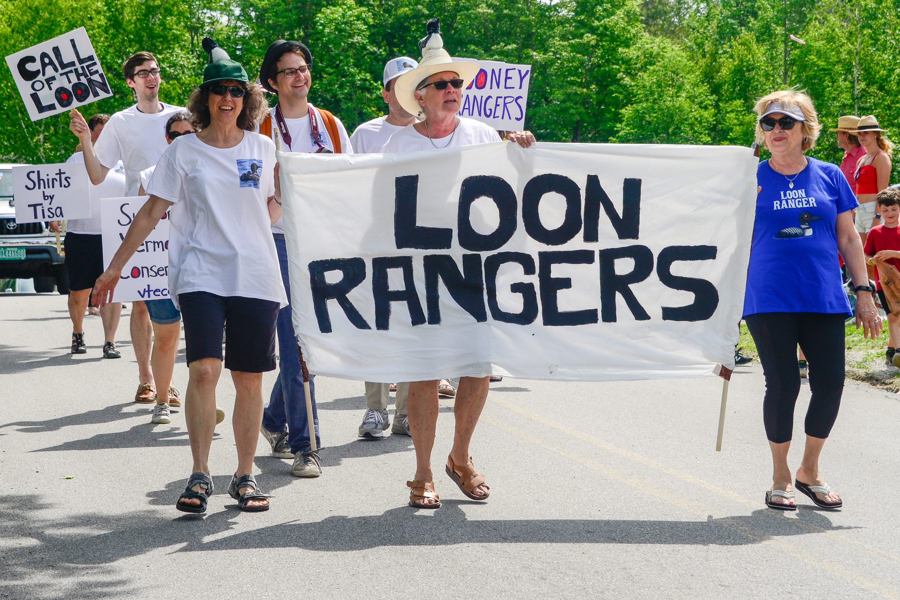 The day before I left on a seven-day vacation in early August, a report came in about a loon wrapped up in fishing line on Lake Ninevah. The loons of Lake Ninevah are lucky to be stewarded by local residents who keep a vigilant eye on “their” loons. This picture from the Mount Holly July 4th Parade says it all: