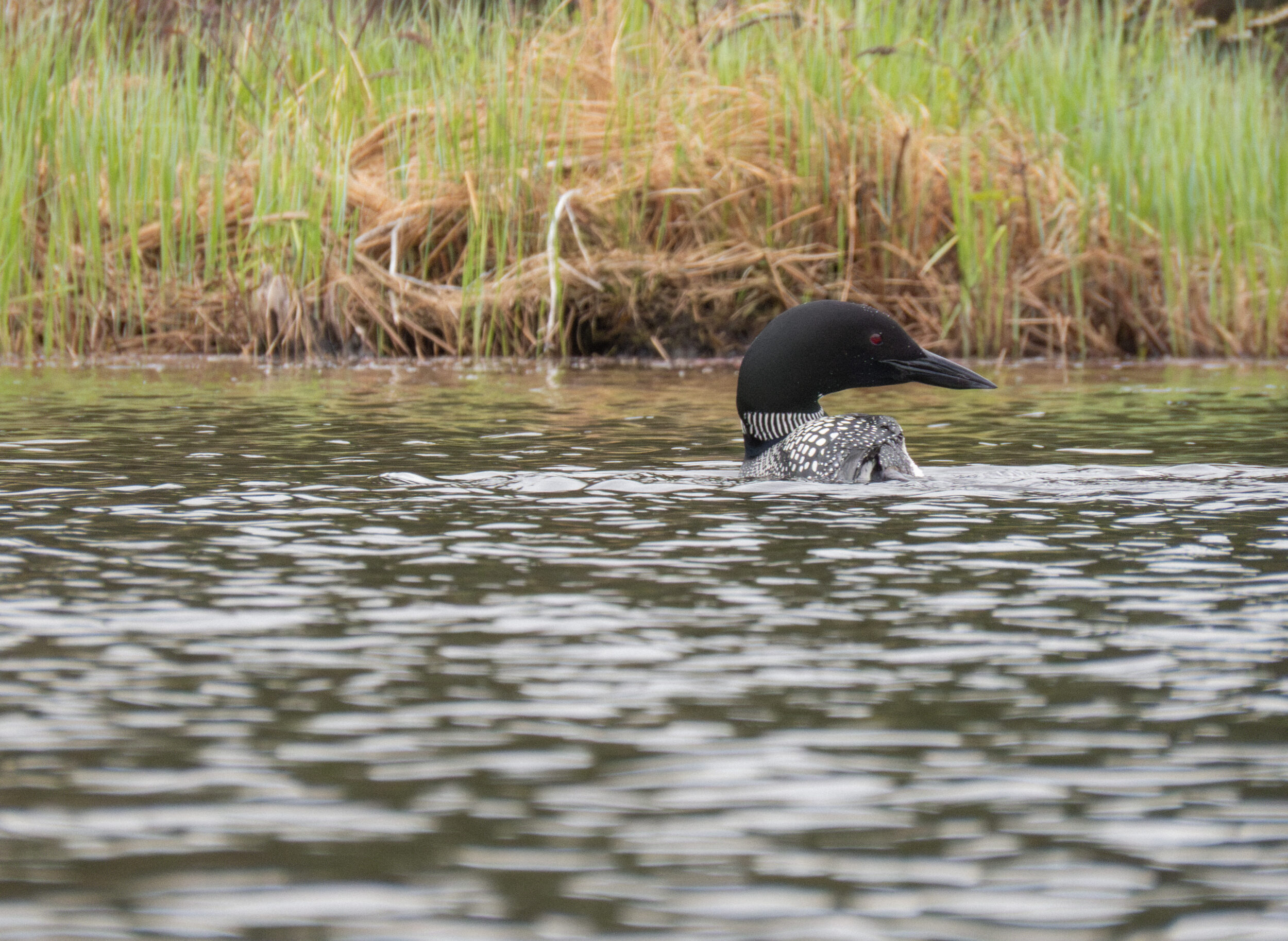 This isn’t necessarily an easy task. The Common Loon builds its mounded nest low and near the water so that the birds, incapable of walking upright, can reach it; it’s often disguised within the tall vegetation that lines the shallows. Without the distinctive black-and-white shape of a parent sitting on the nest, it would be nearly indistinguishable from one of the many mounds of dirt and grass that we paddled past.