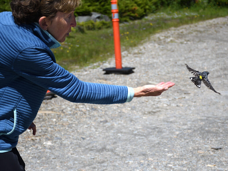 Ann Wittpenn releases a banded male Yellow-rumped (Myrtle) Warbler on Mt. Mansfield, 17 June 2021. © Michael Sargent