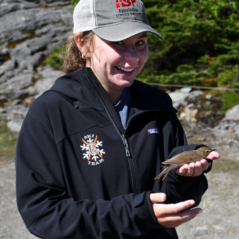 Grace Bucci beams as she releases a banded Swainson’s Thrush on Mt. Mansfield, 17 June 2021. © Michael Sargent