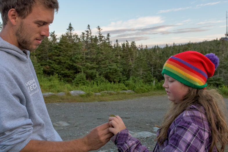 Spencer Hardy transfers a banded Blackpoll Warbler to Antonia (Toni) Howard for release. Mt. Mansfield, 14 August 2019. © Charles Gangas