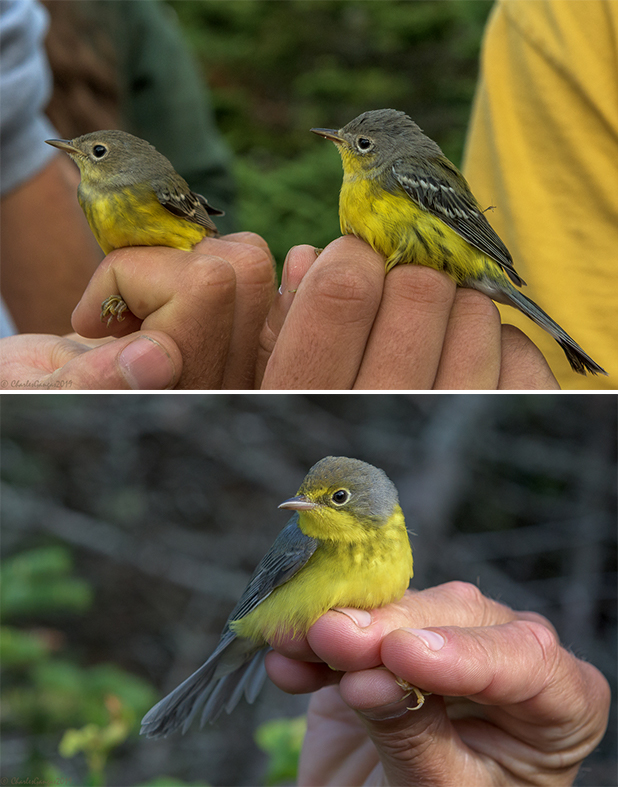 Similarly-plumaged immature Magnolia (two upper birds) and Canada (lower photo) warblers on Mt. Mansfield, 14 August 2019. © Charles Gangas