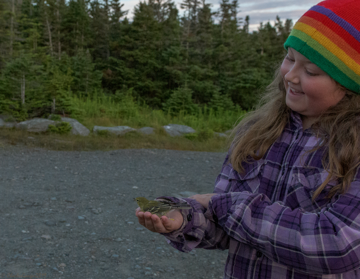 Toni Howard savors a close encounter with an immature banded Blackpoll Warbler prior to its release on Mansfield, 14 August 2019. © Charles Gangas