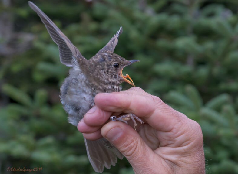 A juvenile Bicknell’s Thrush protests the notion that it may be recaptured in 2020. © Charles Gangas