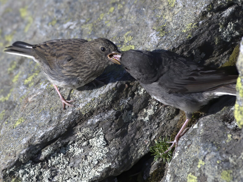 Mansfield’s most conspicuous local birds—both in and away from VCE’s nets—on 13-14 August were Dark-eyed Juncos. Here an adult male feeds a ravenous juvenile. © Michael Sargent