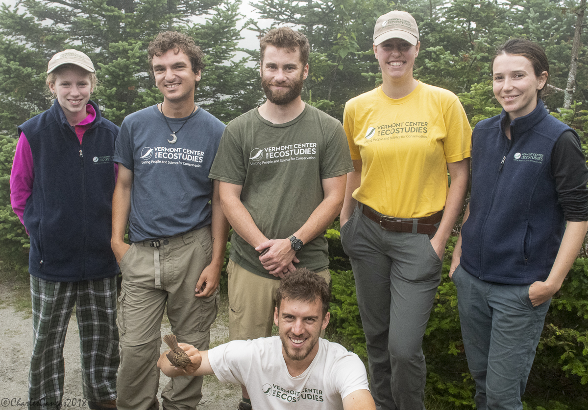 The VCE “hatch-year” field crew on Mansfield, 25 July 2018. From left: Brooke Hindinger, Alex Kulungian, Tim Duclos, Liza Morse, Tara Rodkey. Seated is Spencer Hardy with a banded juvenile Song Sparrow. Photo courtesy of Chuck Gangas.