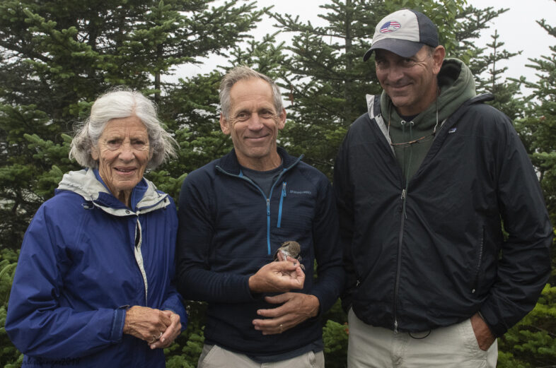 Rimmers invade Mansfield. From left: Clare, Chris (with banded Bicknell’s Thrush) and Dave. Photo courtesy of Chuck Gangas.