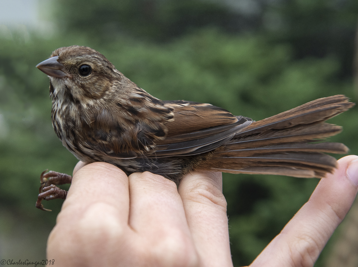 A misplaced juvenile Song Sparrow that turned up in VCE’s nets on Mt. Mansfield, 25 July 2018. Photo courtesy of Chuck Gangas.