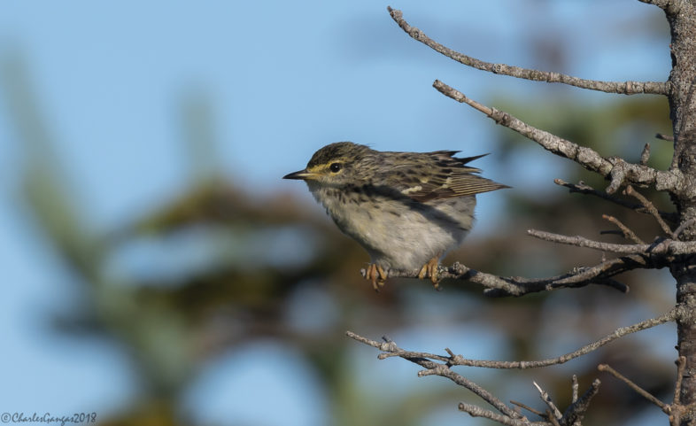 An adult female Blackpoll Warbler peers askance at photographer Chuck Gangas on Mt. Mansfield , 11 July 2018. © Chuck Gangas.