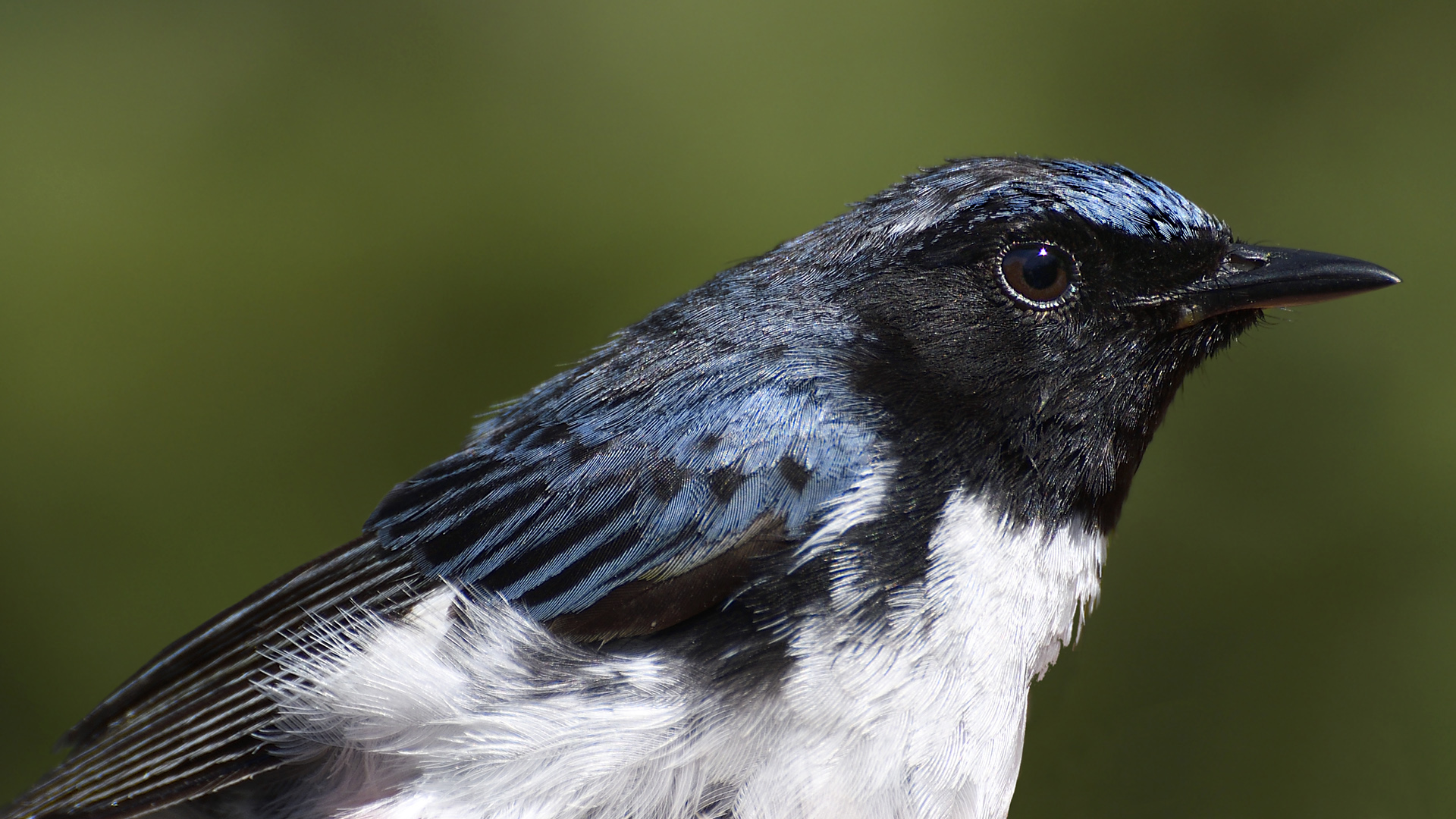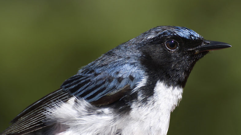 One of two mist-netted male Black-throated Blue Warblers elicted many admiring looks on Mt. Mansfield, 11 July 2018. Photo courtesy of Mike Sargent.