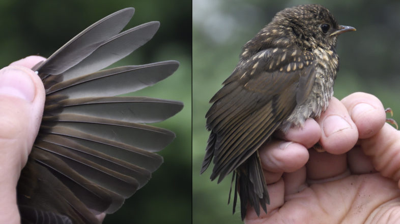 Juvenile Bicknell’s Thrush (right) with spread wing (left) showing slight emargination on outer edge of primary #6 (4th from top), a reliable way to separate this species in juvenal plumage from Swainson’s Thrush. © Michael Sargent