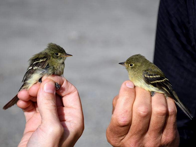 An adult (left) and hatching-year (right) Yellow-bellied Flycatcher banded on Mt. Mansfield, 29 July 2020. Note the difference in wing bars: whitish on adult, buffy-white on immature. © Michael Sargent