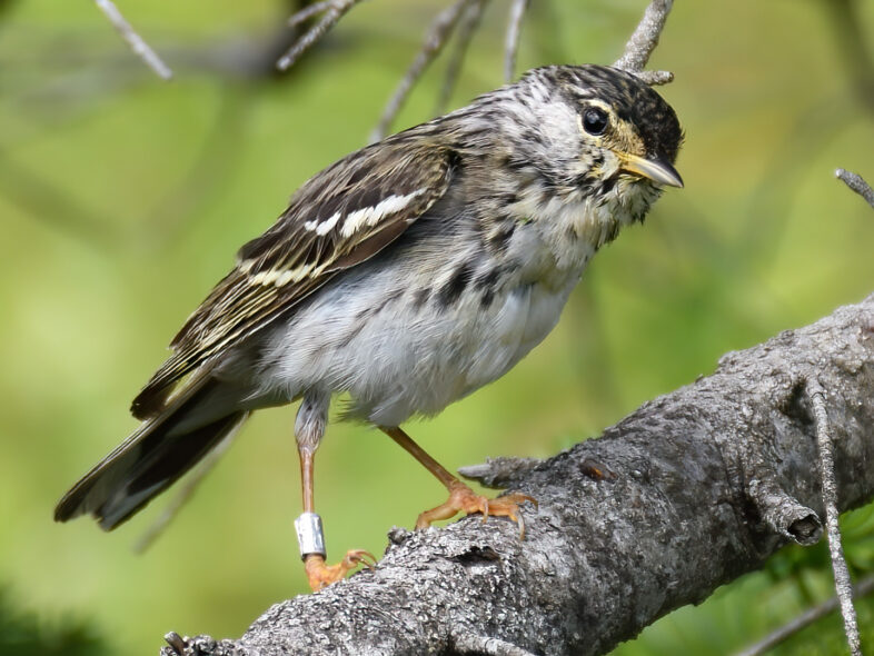 A banded adult female Blackpoll Warbler looks askance immediately after release on Mt. Mansfield, 29 July 2020. © Michael Sargent