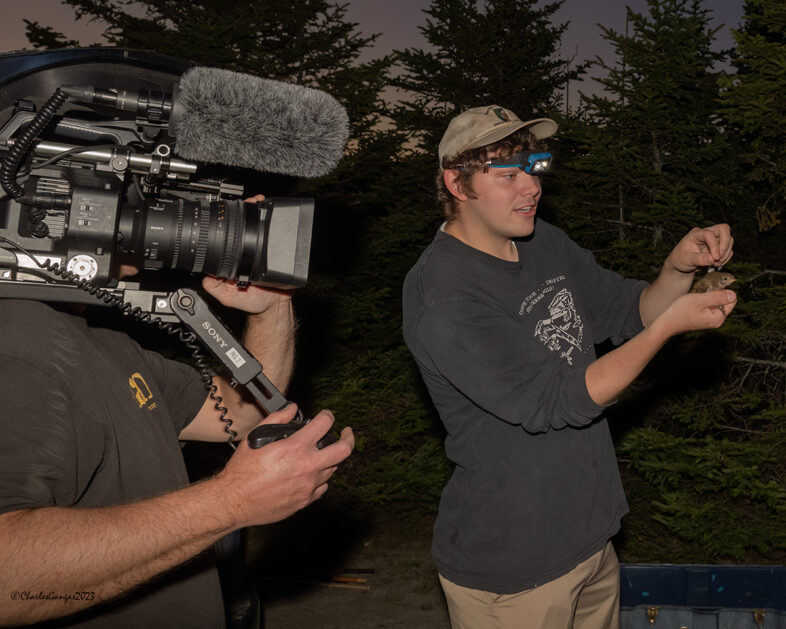 The first BITH capture at 8:15 pm was an unbanded yearling male—nice but not quite fulfilling lofty expectations. With the dusk chorus imminent, we resorted to trickery, setting a vocal playback at our “Nose Gap” net. The ruse worked, and moments later, two banded BITH nestled in the lower trammels, an antenna clearly protruding from the back feathers of one. Mike Dunn was especially elated, as he needed images of a GPS tag recovery to complete a Vermont Public piece he and Abagael Giles had begun last July. As Mike filmed, Kevin gingerly removed GPS tag #50479 from male BITH 2821-79190 (banded in June 2021 and fitted then with tag #50468). Our season was off to a fine start, and we ended the evening with 25 captures total, including 7 BITH. And, the dusk chorus didn’t disappoint, with BITH courtship flight songs continuing well after dark.
