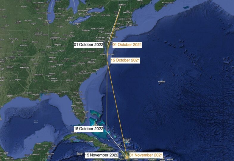 Consecutive years’ GPS tracks (fall 2021 and 2022) of Bicknell’s Thrush 2821-79231, showing nearly identical autumn migration paths in both years, and presumed overwintering sites in the Dominican Republic’s Sierra de Neiba.